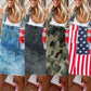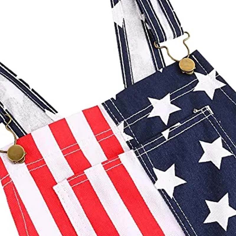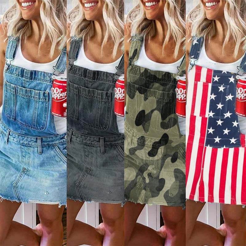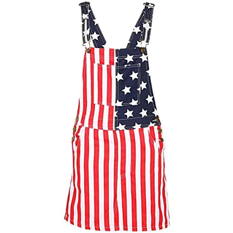 - Features: women’s denim bib overall dress, American Flag print/ blue / gray/ camel, USA Patriotic Denim bib shorts, overalls shorts, adjustable straps, big pockets.