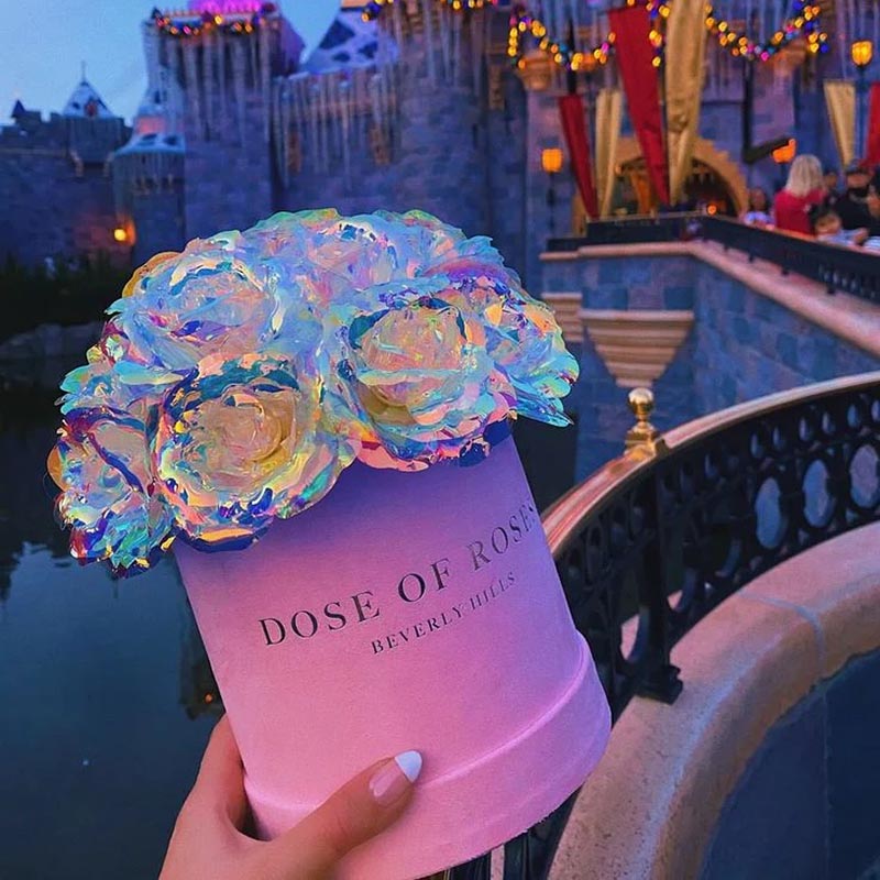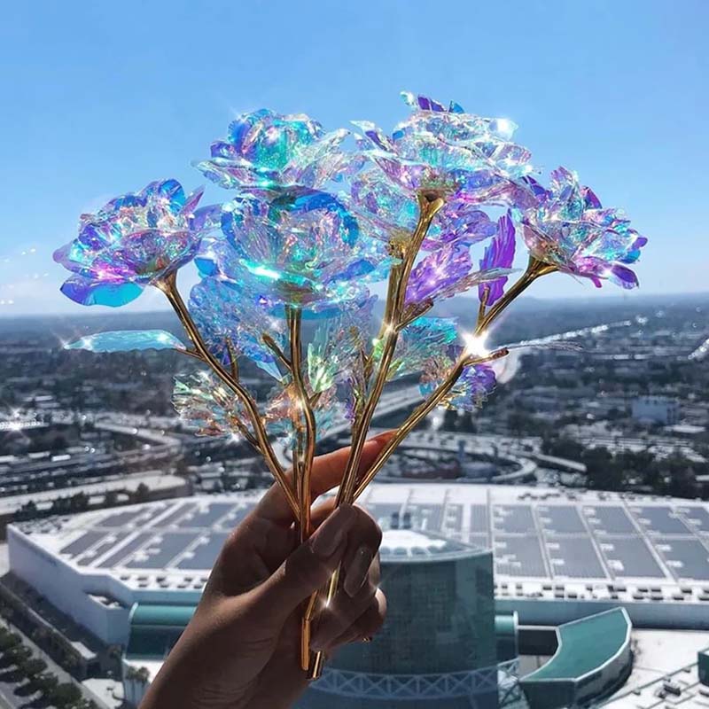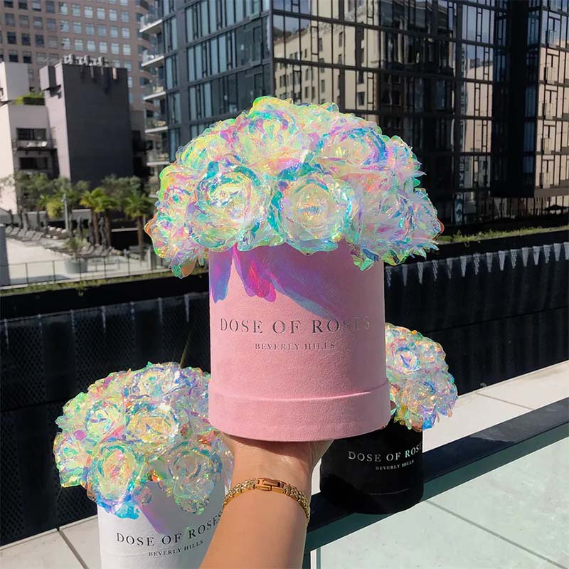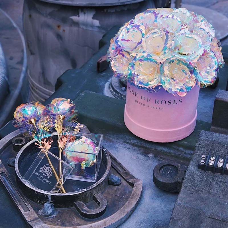 Finally, we cover them in an iridescent holographic coating to make the rose and petals sparkle in the light. Then we hand-place each iridescent holographic coated petal which makes the roses look so eye-catching!