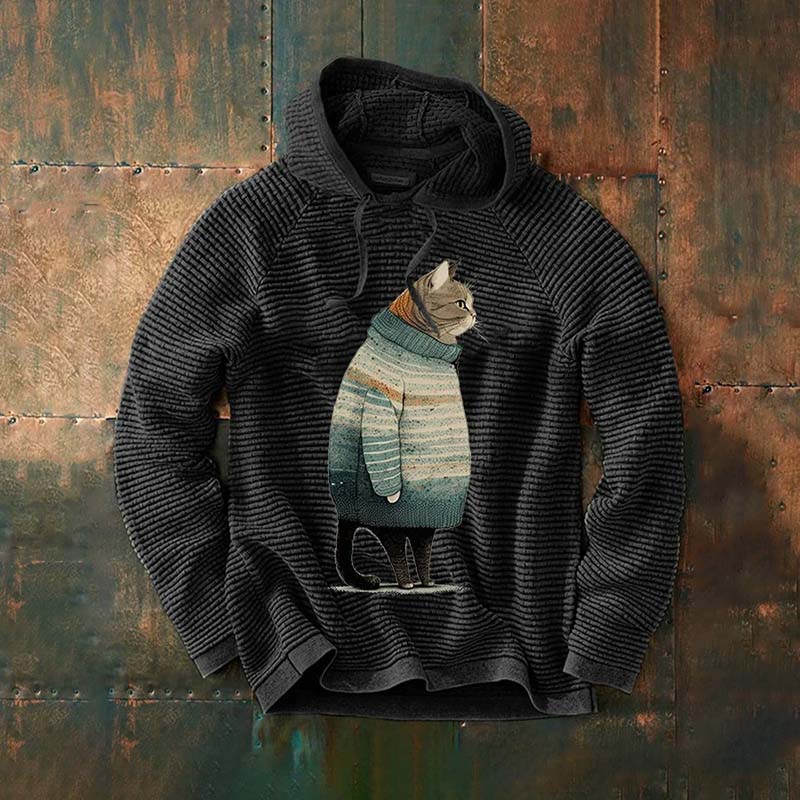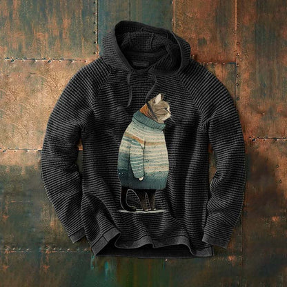 Men's Winter Cat Print Waffle Hooded Sweatshirt