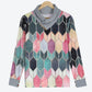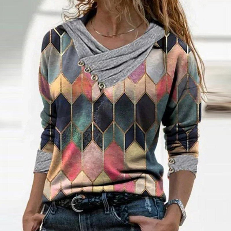 This pretty deco-inspired print in watercolor shades is one of Daccla’s reoccurring favorites. The print is seen here on a long sleeve top that is designed with a draped and asymmetrical collar and solid cuffs—both with rustic button detail. Pull it on for a stylish color and pattern boost.