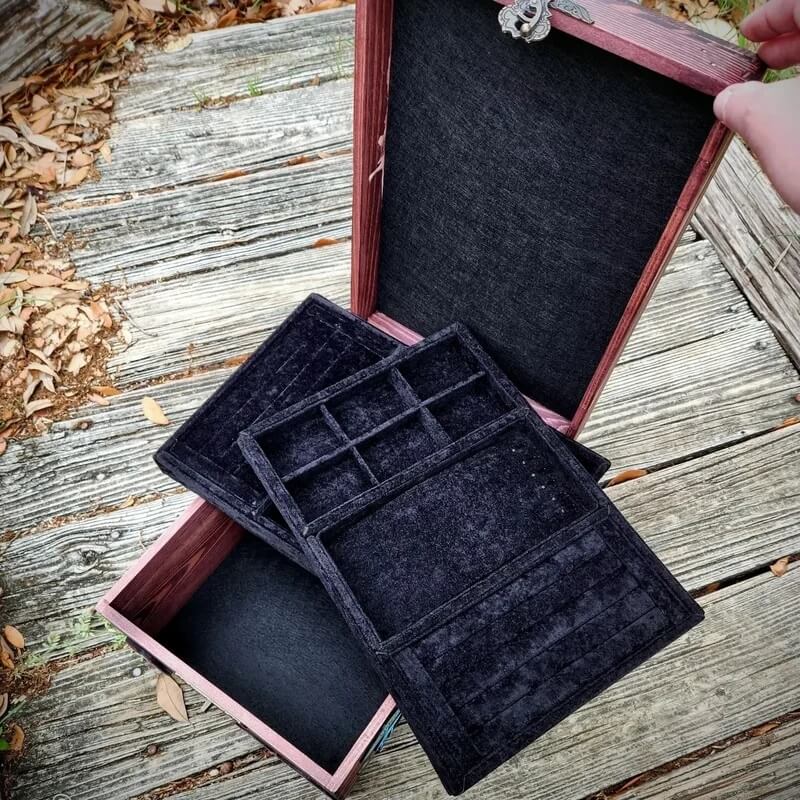 - The interior compartments are lined with velvet and black felt to protect delicate jewelry items from scratches and damage.