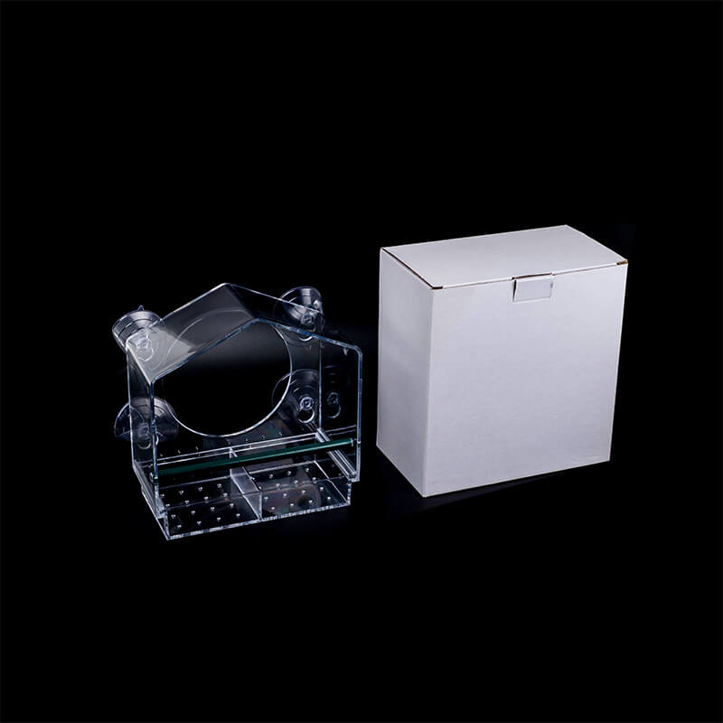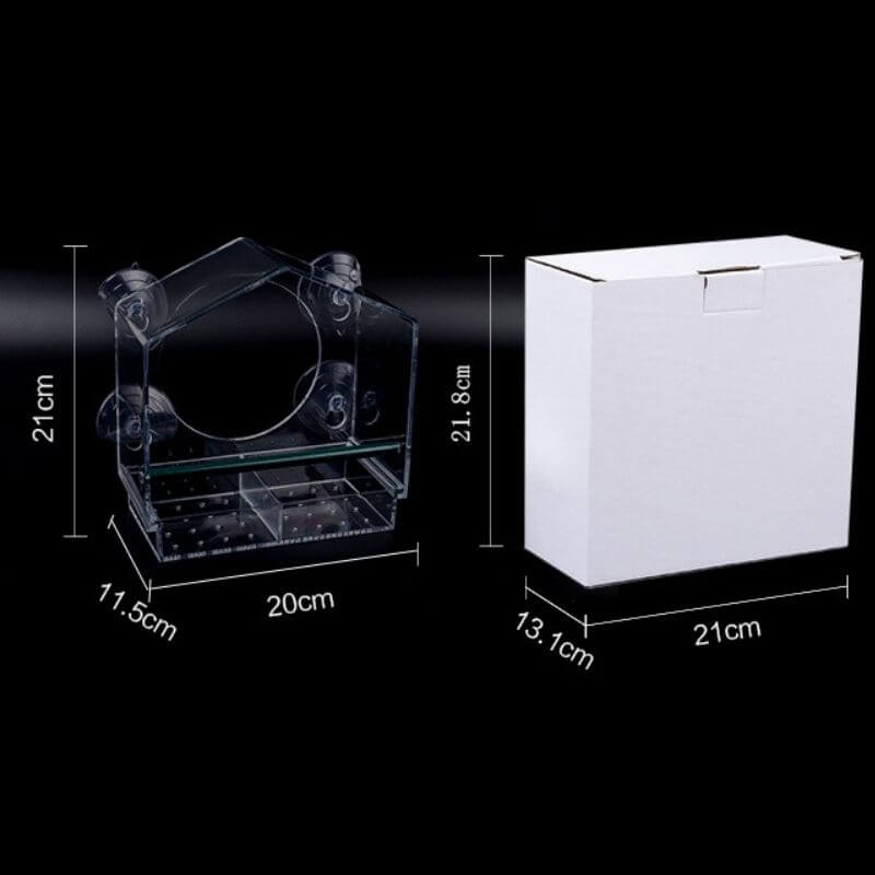 This is the bird feeder that attaches to a window and enables ornithologists to watch birds up close. The feeder welcomes winged visitors through a 3.15" diameter entrance and contains two drawers that hold up to 28 oz. of seed. Made of acrylic, it secures to glass with four included suction cups. 7.87'' L x 4.53" W x 8.27" H.